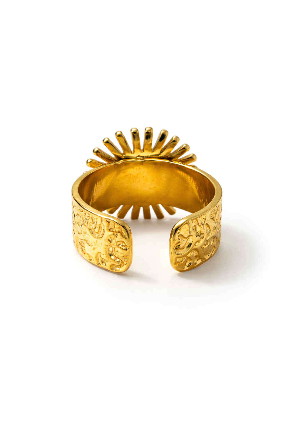 Anillo dorado de diseño solar con piedra central azul profunda, inspirado en la energía del sol y la fuerza de la luz. Sus rayos dorados aportan carácter y elegancia, convirtiéndolo en una pieza protagonista ideal para cualquier ocasión.
